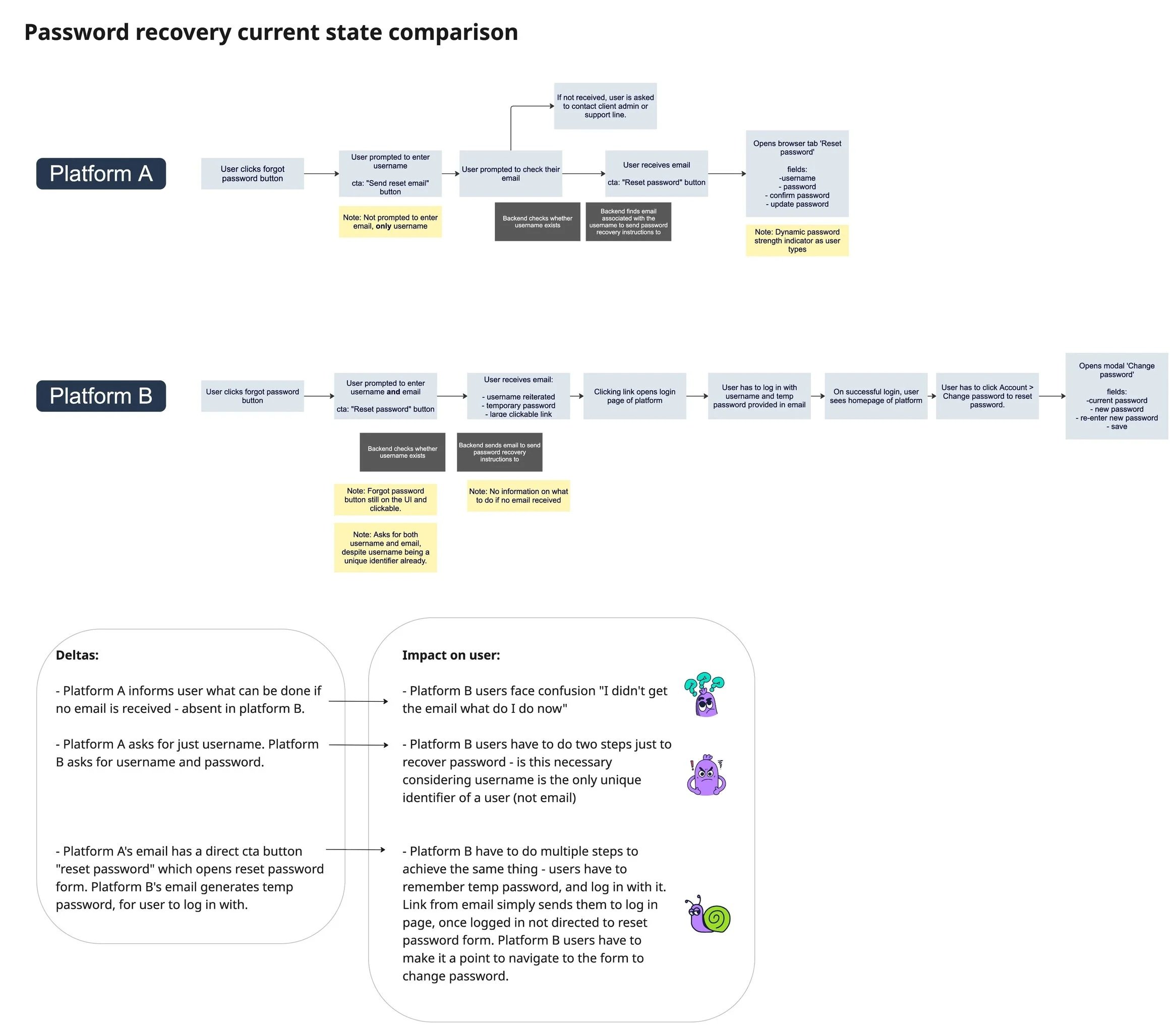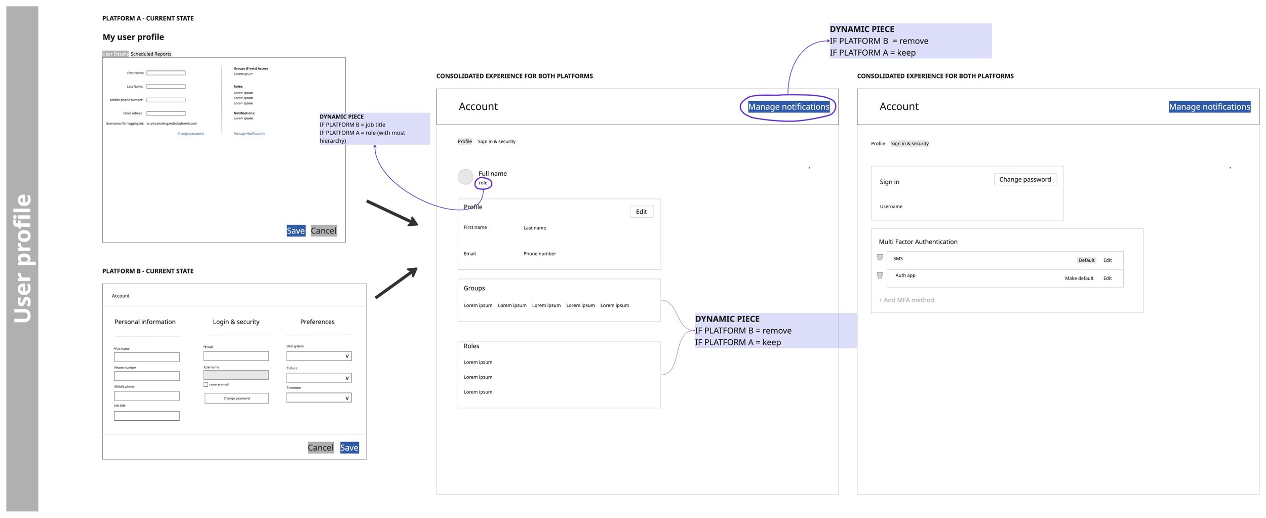 At the system level, I mapped every surface affected by these changes: from profiles and security settings to roles, navigation, and recovery flows. This ensured we could unify the experience without breaking access, permissions, or trust across Platform A and Platform B.
