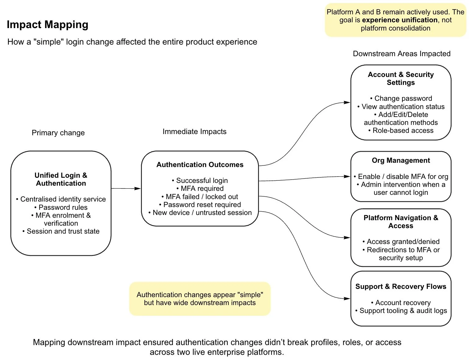 There was no MFA, no shared login experience, and no consistent mental model. Users moving between products faced friction, while internal teams were duplicating work and increasing security risk.