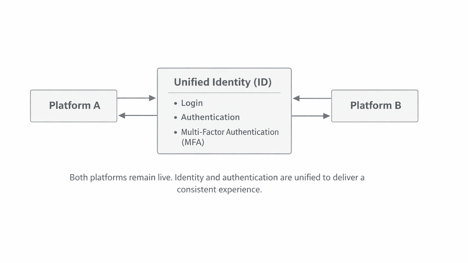 There was no MFA, no shared identity, and no consistent experience. Teams were building the same features twice, adding security risk and complexity.